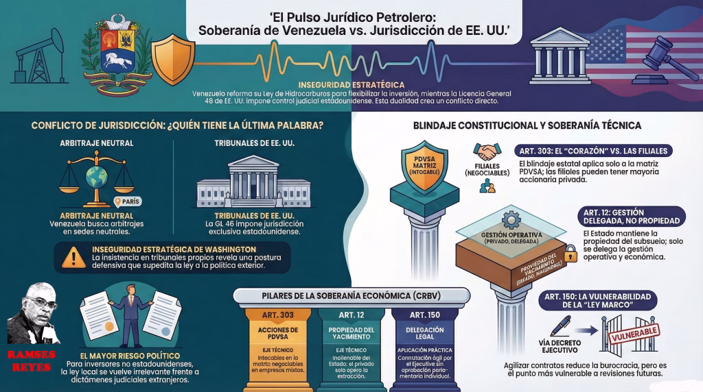 Existe una contradicción estructural insalvable: mientras la reforma venezolana busca blindar la inversión mediante arbitrajes internacionales neutrales (como en sedes de París), la GL 46 impone la jurisdicción exclusiva de los tribunales estadounidenses.