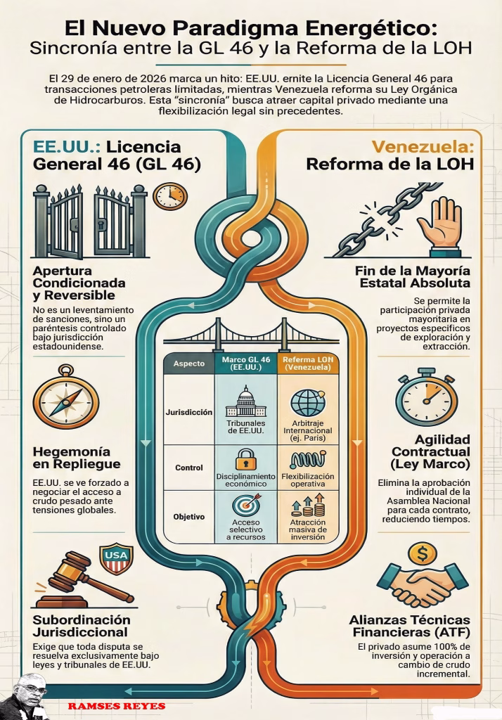 El 29 de enero de 2026 se consolidó como el eje gravitacional de una nueva arquitectura energética regional. Este punto de inflexión no debe analizarse como un evento fortuito, sino como la culminación de un movimiento estratégico coordinado. La emisión de la Licencia General 46 (GL 46) por parte del Tesoro de los EE. UU. y la simultánea reforma de la Ley Orgánica de Hidrocarburos (LOH) en Venezuela representan una respuesta institucional a la crisis de los modelos previos. Resulta imperativo destacar que este diseño fiscal y operativo fue premeditado: el anuncio previo del 15 de enero de 2026, concerniente a los fondos de «Protección Social» y «Soberano de Infraestructura», estableció la infraestructura de recepción de renta antes de que se abrieran las compuertas legales de la inversión, sugiriendo una planificación de Estado para un escenario de mayores flujos de caja.